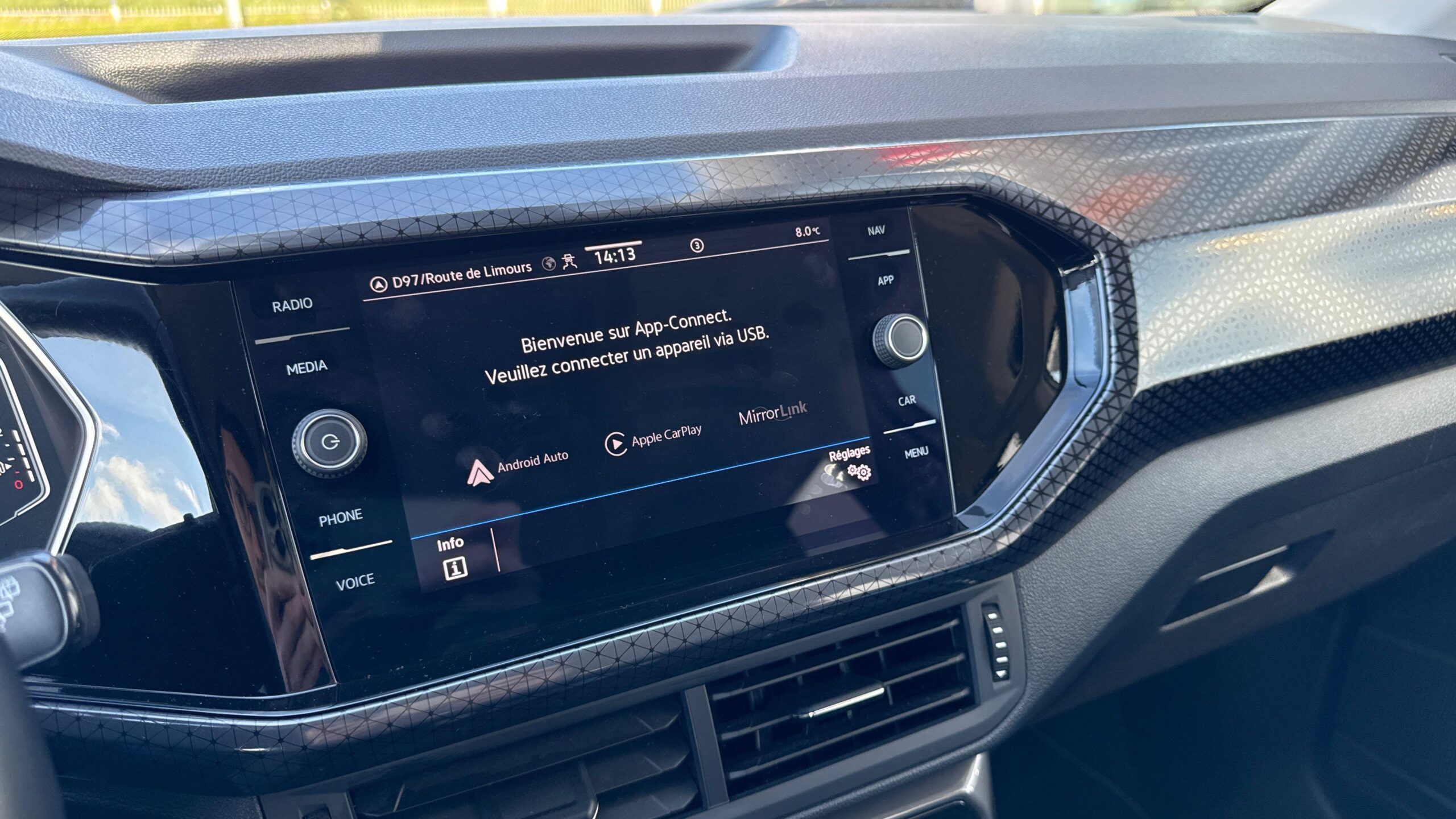 "App-Connect" sans fil affichage et contrôle via l'écran tactile du véhicule, du contenu, des fonctions et des applications compatibles présents sur le Smartphone (compatibilité avec les systèmes Apple CarPlay et Android Auto). Fonction sans fil uniquement disponible avec Apple CarPlay. Seuls les contenus validés et utilisables en «main libre» peuvent fonctionner
