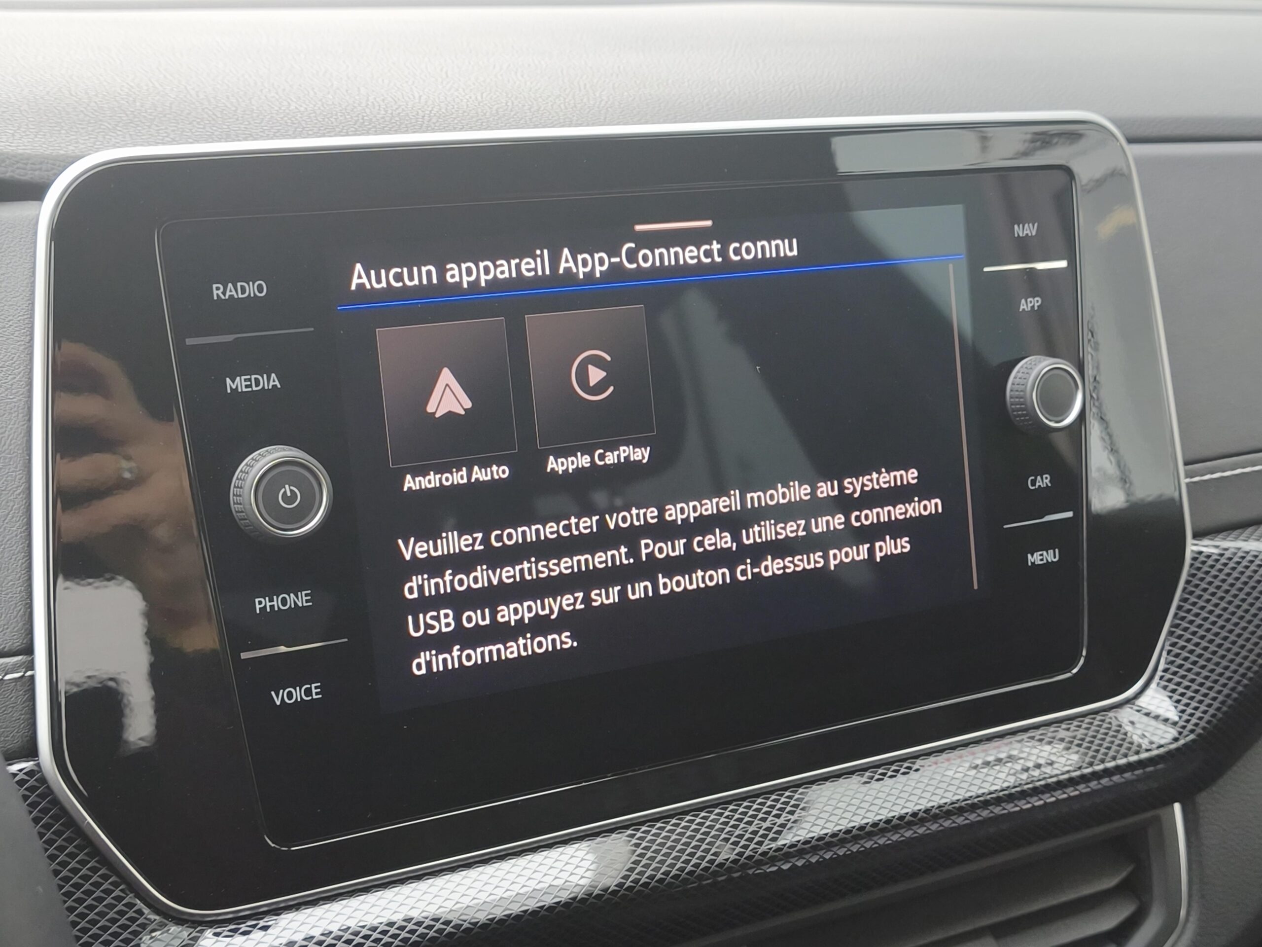 App-Connect sans fil: affichage et contrôle via l'écran tactile de la voiture, du contenu, des fonctions et des applications compatibles présents sur le Smartphone (compatibilité avec les systèmes Apple CarPlay et Android Auto). Fonction sans fil uniquement disponible avec Apple CarPlay