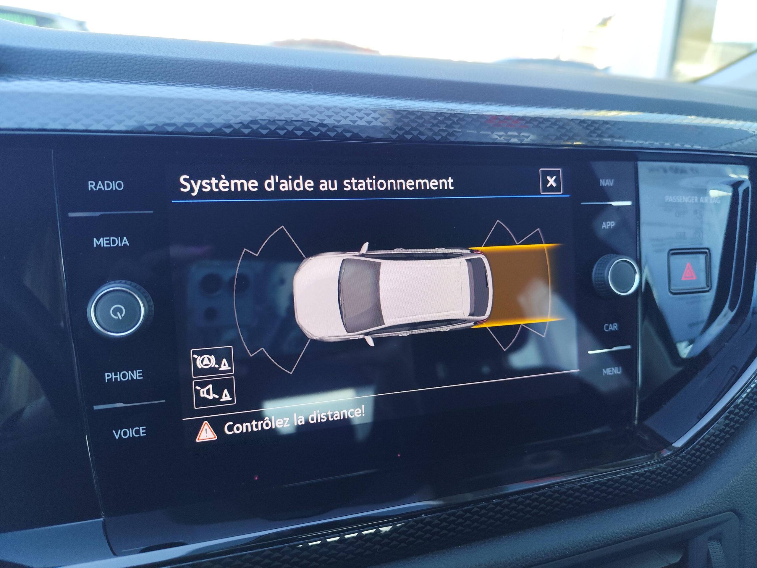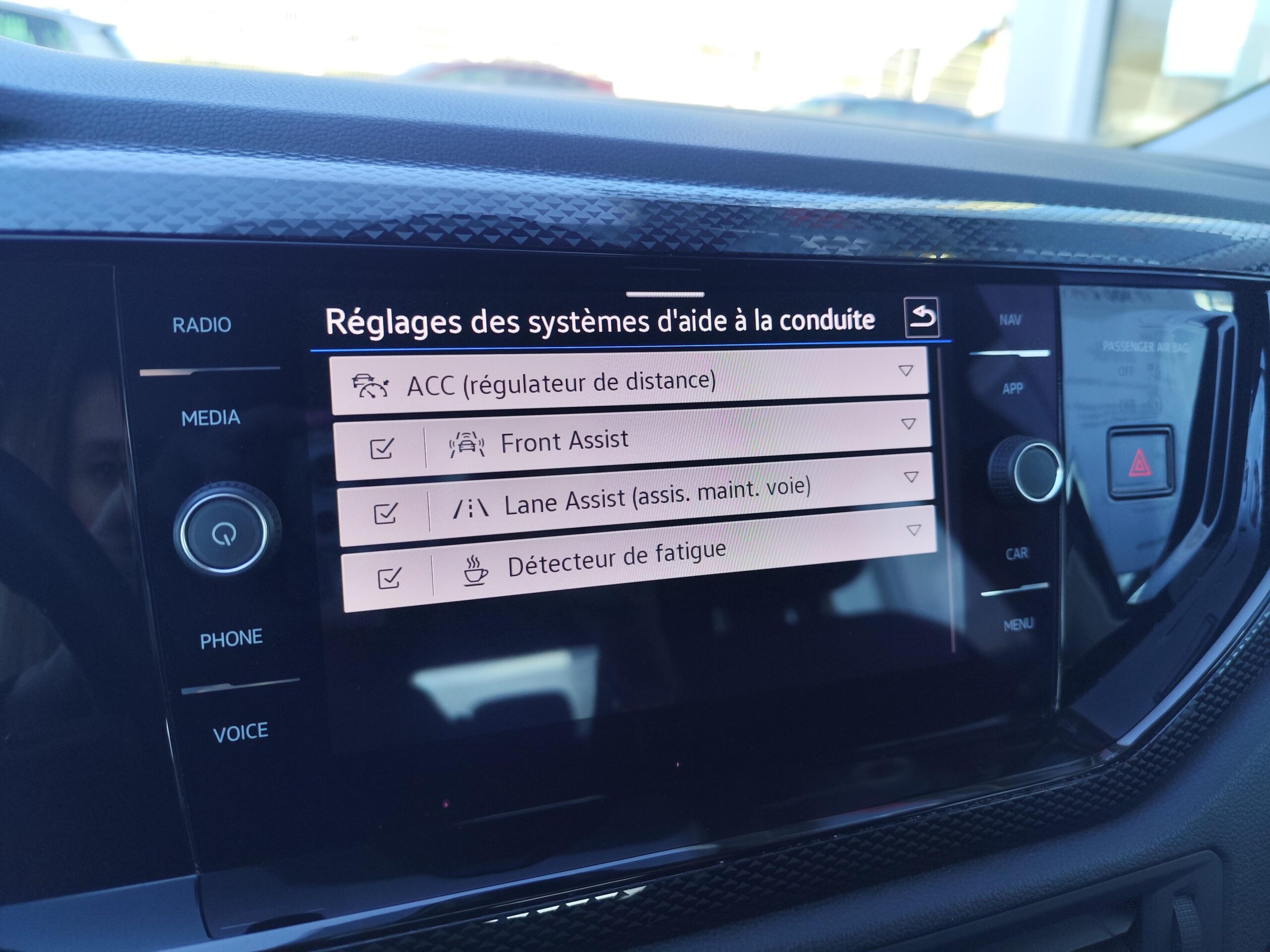 Front Assist: système de surveillance périmétrique contribuant à la prévention des collisions avec fonction de détection des piétons et des cyclistes. Ce système freine automatiquement le véhicule en cas de détection dobstacle aussi bien en ville que sur autoroute