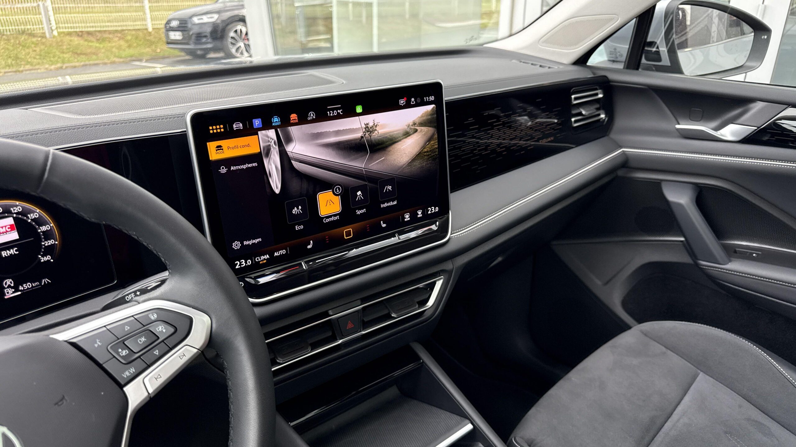 Drive Experience Control: Sélecteur de profil de conduite avec écran OLED tactile - Permet d'ajuster le volume, le profil de conduite ainsi que les "Atmosphères" - Appuyer sur le sélecteur pour afficher les profils de conduite, passez votre doigt sur l'écran tactile pour basculer sur le choix des "Atmosphères" - Des "Atmosphères" sont déja paramétrées dans le véhicule mais vous pouvez créer vos propres atmosphères en définissant une playlist, un affichage Digital Cockpit, un éclairage d'ambiance, un niveau sonore et une tonalité