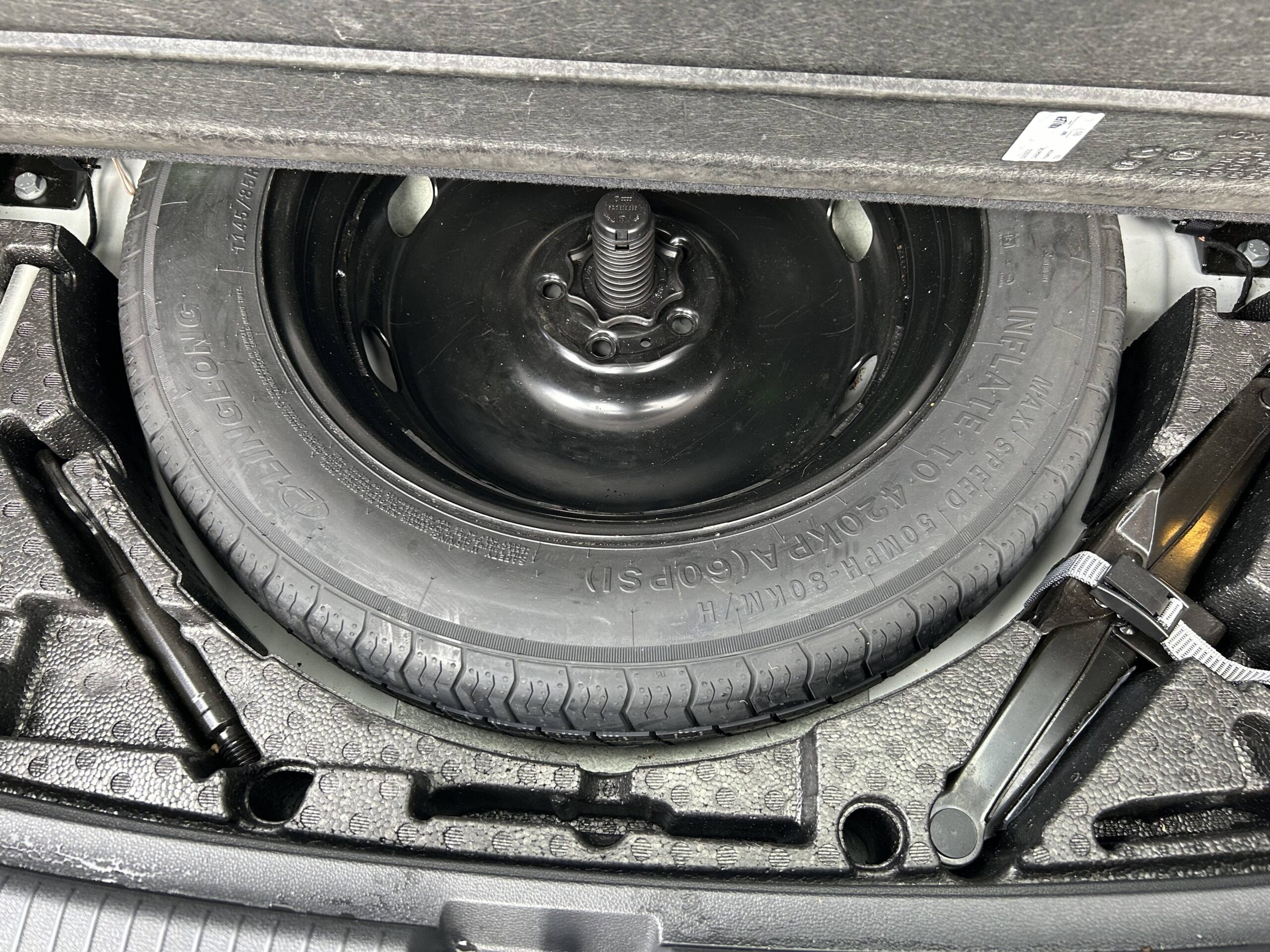 Roue de secours à encombrement réduit, outillage de bord et cric